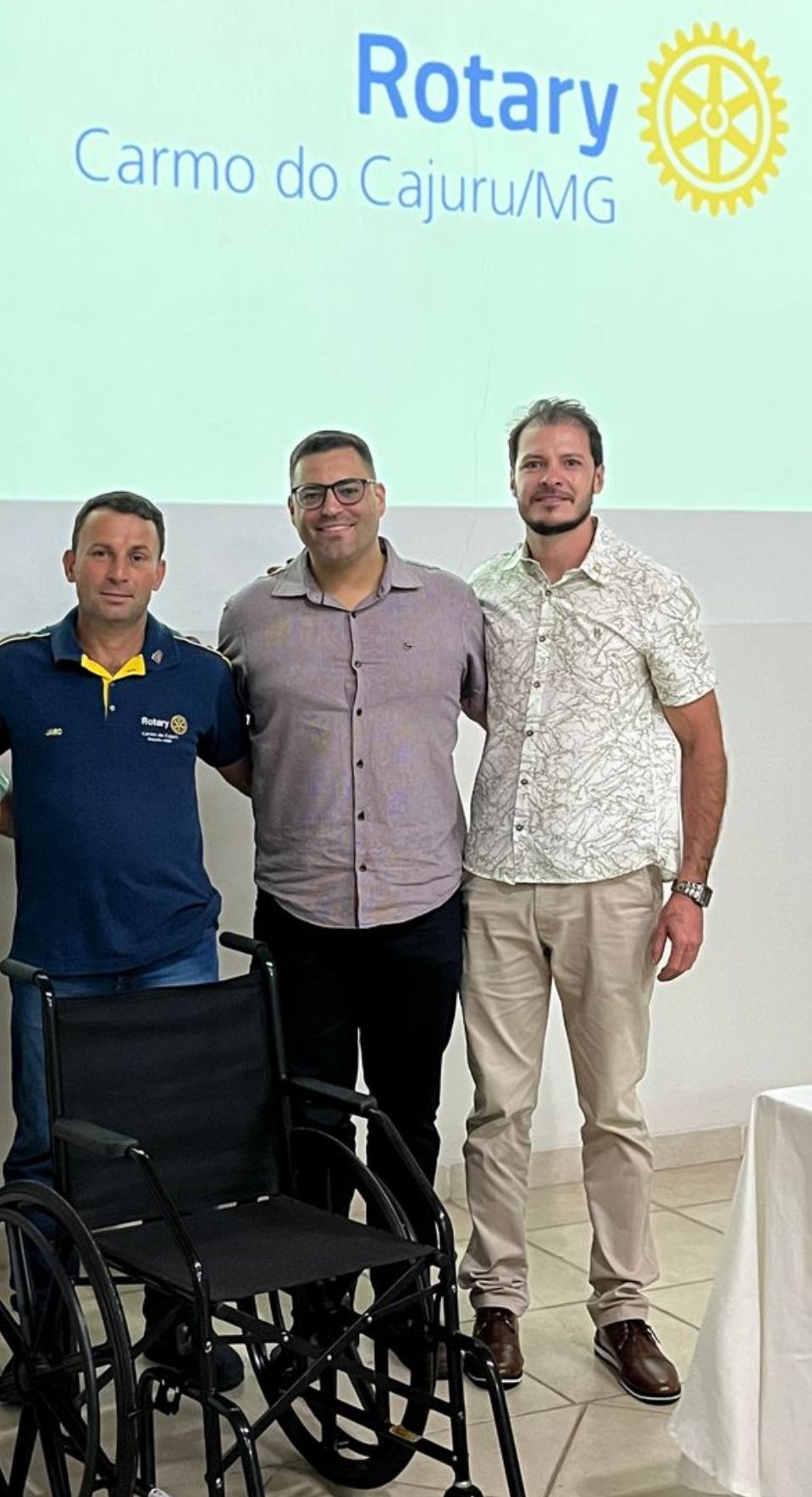 O Rotary Club de Carmo do Cajuru, MG (distrito 4560), entregou uma cadeira de rodas para a Clínica Municipal de Carmo do Cajuru. No momento da doação, ocorrida em 6 de março na sede do clube, o presidente do clube Jairo Bessa (na foto, o primeiro à esquerda), recebeu o secretário municipal de Saúde, Guilherme Lacerda (ao centro) e o presidente do Rotary Club de Divinópolis-Oeste, Gabriel Ferreira.