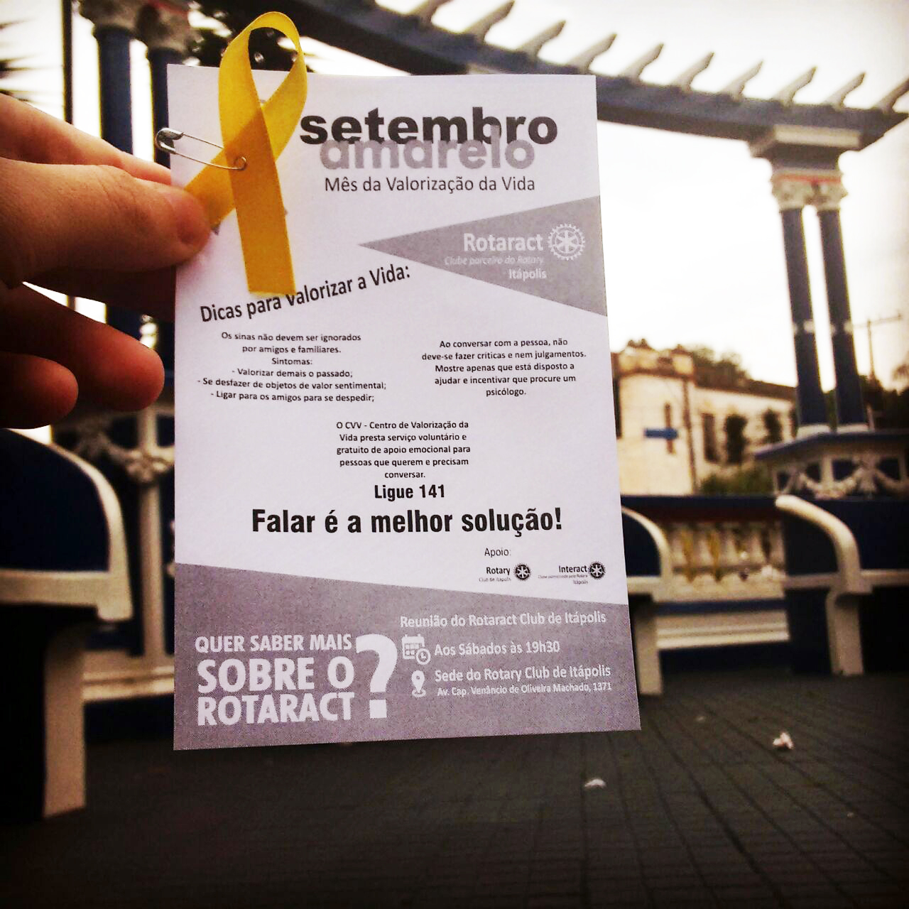 Em iniciativa referente ao Setembro Amarelo, campanha do Centro de Valorização da Vida, Conselho Federal de Medicina e Associação Brasileira de Psiquiatria que alerta para o aumento dos casos de suicídio, o Rotaract Club de Itápolis, SP (distrito 4480), organizou um pedágio com distribuição de panfletos informativos e fitas amarelas que reforçam a visibilidade da ação.